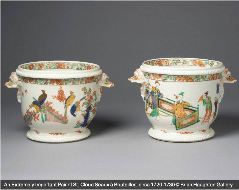 Following the performance, deer hunts were organised for the king across the Chantilly estate. Afterwards, the game was then presented along with an abundance of food and all kinds of liquors. In the eighteenth century, wine was served with each new course and connoisseurs were obsessed with keeping optimal temperatures, especially given the improvements made to wines such as champagne produced by Dom Pierre Perignon (1638-1715); hence, the need for wine coolers such as this pair of St. Cloud Seaux à Bouteilles, which shows front and back designs of birds and courtiers.