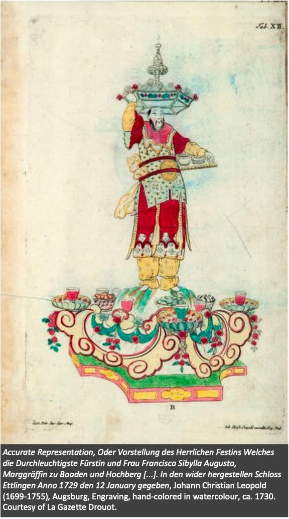 Engravings also provide a detailed examination of the table settings, laid with towering stands featuring oriental figures holding up bowls of confection.