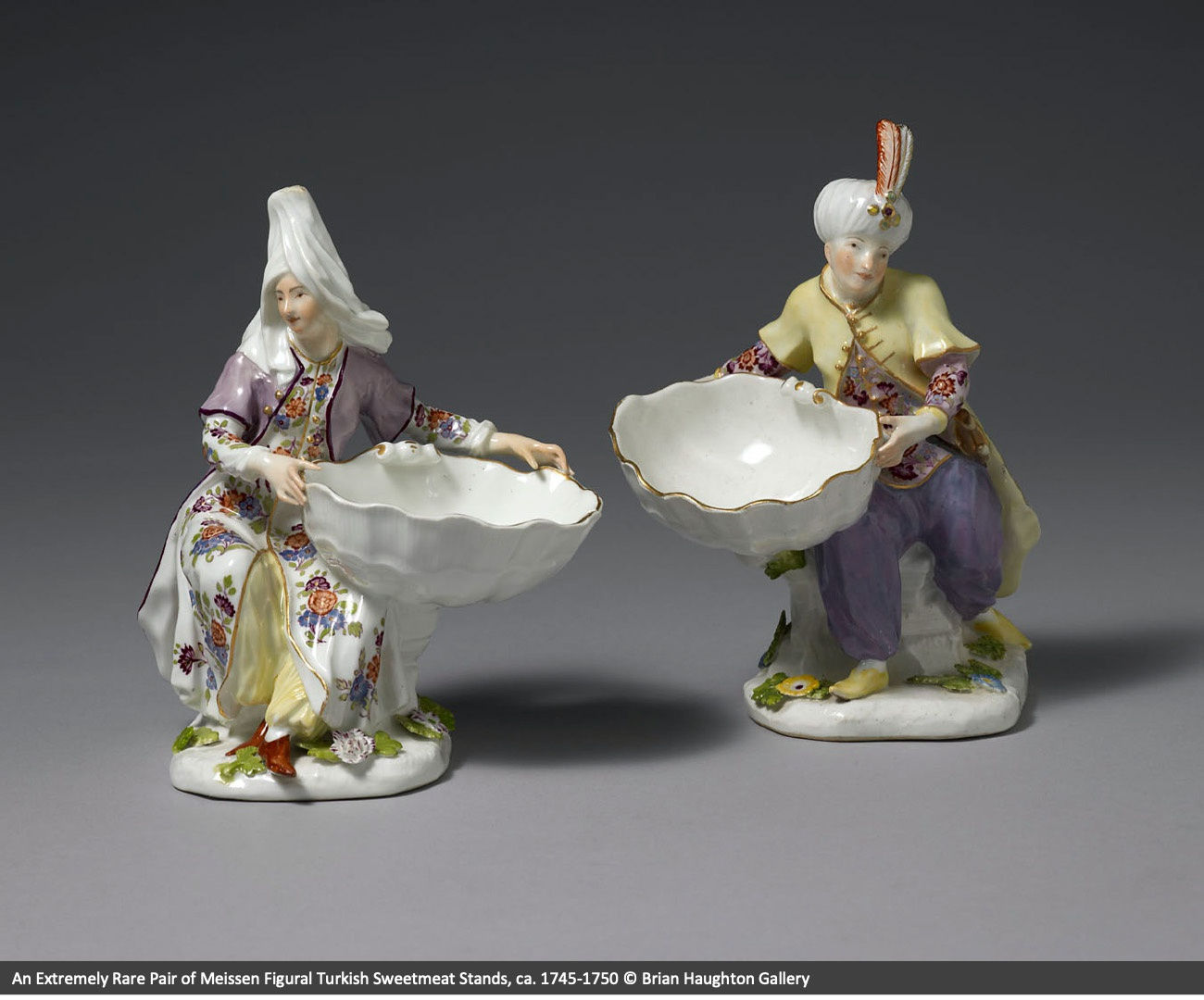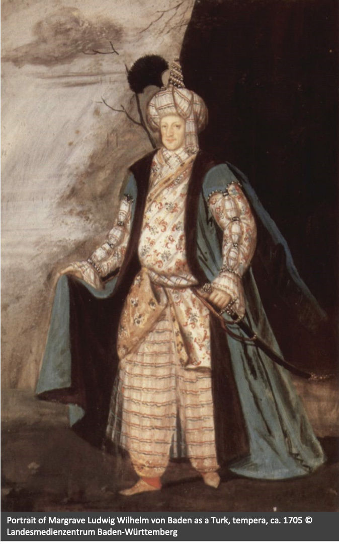 The Margrave’s victory at Slankamen was his greatest military achievement, for which he received the Order of the Golden Fleece. In the following years, successive victories would lead to a signed treaty with the Ottoman Empire. Through diplomatic relations, peaceful encounters with the former enemy contributed to the turquerie taste in fashion, as seen in the costume worn at banquets by the Türkenlouis. In the decorative arts, turquerie inspired porcelain models as seen in the Pair of Meissen Figural Turkish Sweetmeat Stands.